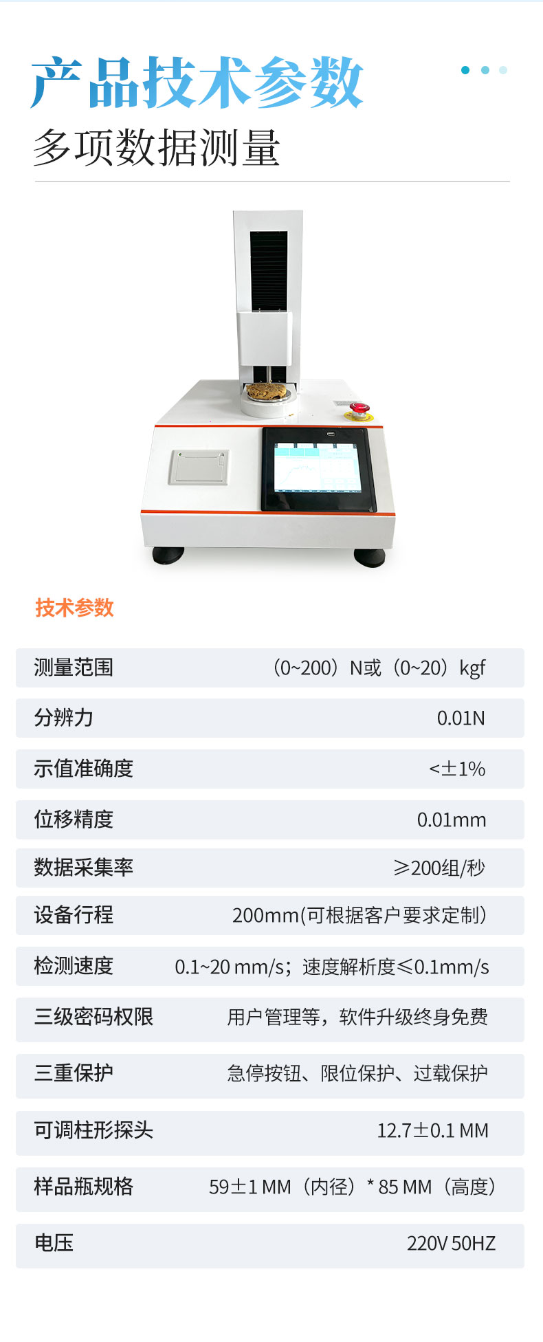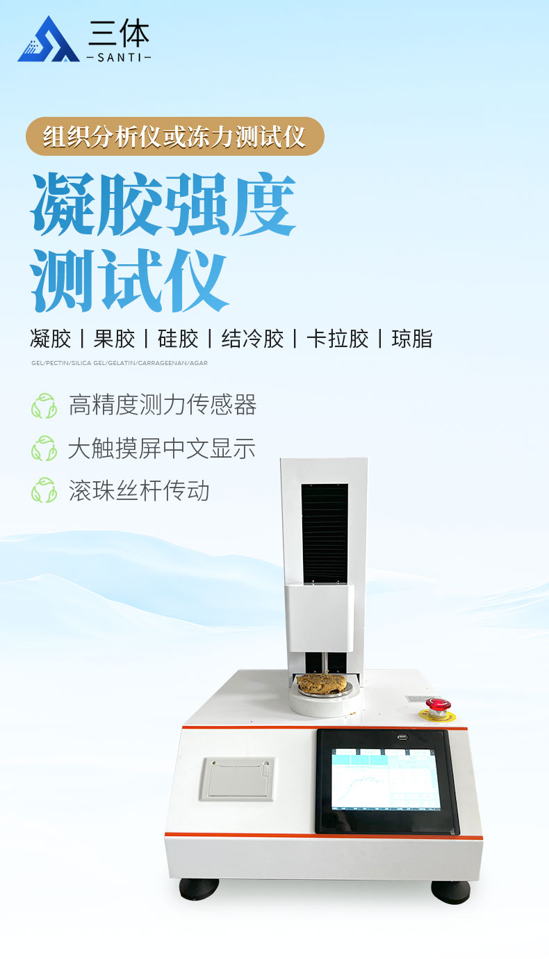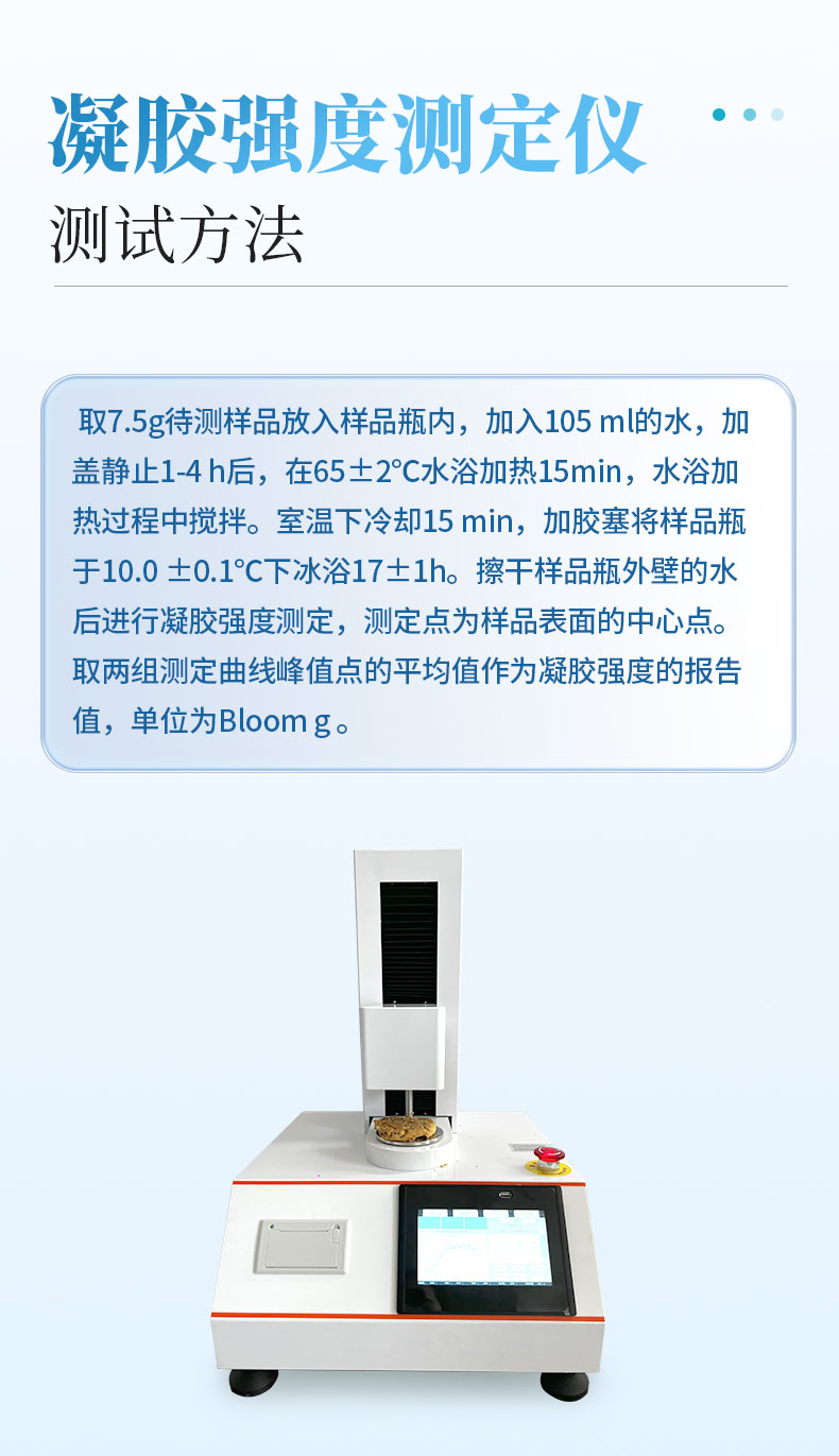 凝膠強度測儀適用于凝膠、果膠、硅膠、結冷膠、卡拉膠、瓊脂、阿拉伯膠、黃原膠、魔芋膠和瓜爾膠等的破裂強度、彈性、延展性、拉伸強度、粘附度、回復性等測試。凝膠強度測儀也叫凍力強度儀 ,明膠凝凍強度測定儀,組織分析儀或凍力測試儀。滿足標準:1、國標GB6783-2013 《食品添加劑明膠》中有關于凝膠強度的