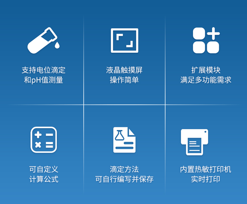 自動電位滴定儀是一種用于化學(xué)分析的精密儀器,他通過自動添加滴定劑來確定樣品中特定成分的濃度。該儀器基于電位滴定原理工作,即根據(jù)在滴定過程中電池電動勢的變化來確定滴定終點的一款滴定設(shè)備。設(shè)備滿足國家檢定規(guī)程JJG 814-2015《自動電位滴定儀》儀器級別中的0.05級別,即儀器**示值誤差為±1.5%,儀器示值重復(fù)性≤0.2%